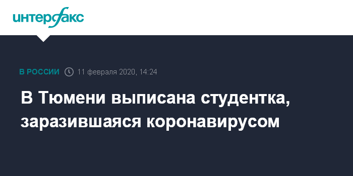Москва. 11 февраля. INTERFAX.RU - В Тюмени из инфекционной больницы выписали студентку из Китая, которая перенесла пневмонию, вызванную уханьским коронавирусом. Об этом сообщила глава областного департамента здравоохранения Инна Куликова на заседании оперативного штаба по борьбе с коронавирусом.