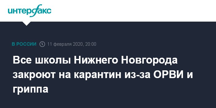 Москва. 11 февраля. INTERFAX.RU - Карантин вводится во всех школах Нижнего Новгорода с 13 февраля из-за всплеска заболеваемости гриппом и ОРВИ, сообщает департамент образования администрации города.