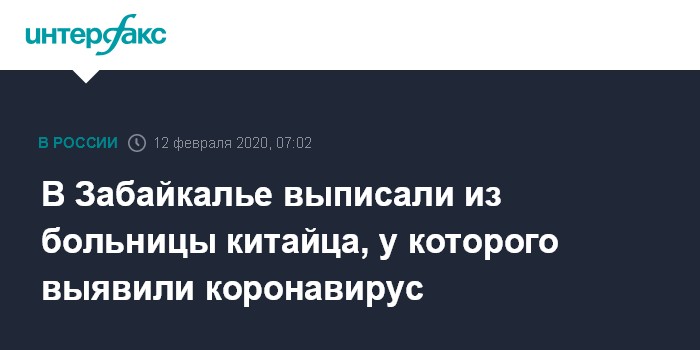 Москва. 12 февраля. INTERFAX.RU - В Забайкальском крае гражданин Китая, у которого ранее диагностировали новый коронавирус, выписан из краевой клинической инфекционной больницы после необходимого лечения, сообщили агентству "Интерфакс" в региональном ситуационном центре.