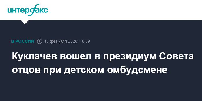 "Сегодня в состав президиума Совета отцов при уполномоченном при президенте РФ по правам ребенка вошел Юрий Дмитриевич Куклачев - многодетный отец, (...), Народный артист РСФСР и основатель образовательного проекта "Школа доброты", - говорится в сообщении Кузнецовой в среду.