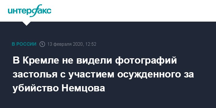 Москва. 13 февраля. INTERFAX.RU - В Кремле заявили, что не знакомы с публикациями в интернете фотографий, на которых осужденный за убийство оппозиционного политика Бориса Немцова Заур Дадаев сидит в компании, участвуя в застолье в колонии.