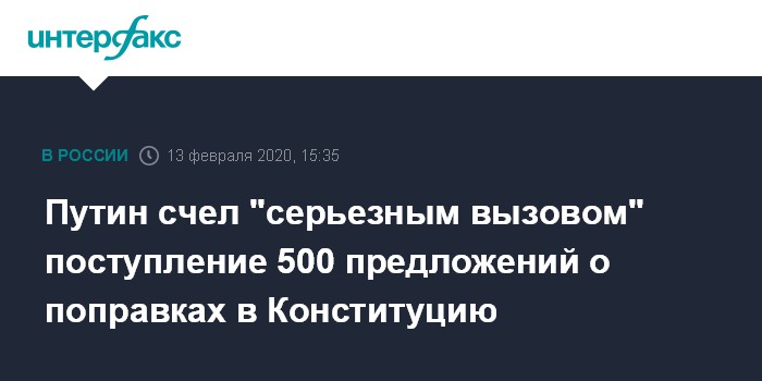 Москва. 13 февраля. INTERFAX.RU - В рабочую группу по подготовке предложений о внесении поправок в Конституцию РФ поступило более 500 предложений об изменении Основного закона, что стало серьезным вызовом, заявил президент РФ Владимир Путин.
