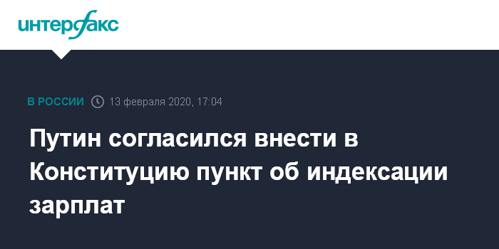 Москва. 13 февраля. INTERFAX.RU - Президент Владимир Путин поддержал предложение профсоюзов внести в Конституцию поправку об обязательной индексации зарплат. Ранее он сам предлагал внести туда положение об обязательной ежегодной индексации пенсий.