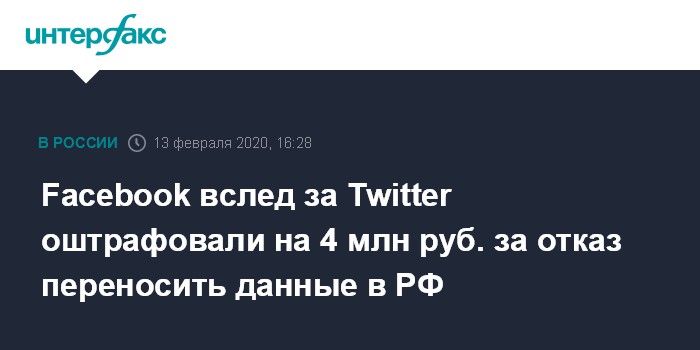 Роскомнадзор 31 января возбудил административное производство в отношении Facebook и Twitter. Согласно позиции регулятора, компании не предоставили в установленный срок сведений о выполнении требований о локализации баз данных российских пользователей соответствующих социальных сетей на серверах, расположенных на территории РФ, что предусмотрено законом "О персональных данных".