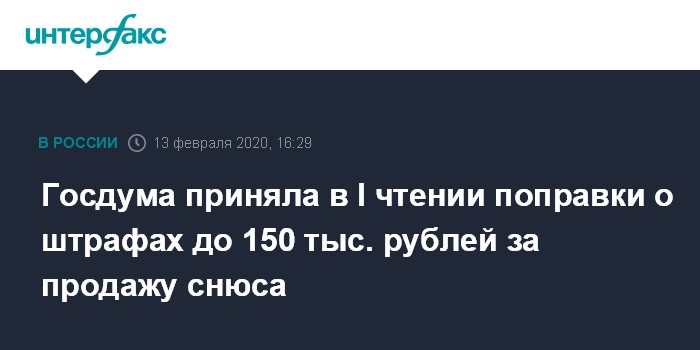 Москва. 13 февраля. INTERFAX.RU - Госдума в четверг приняла в первом чтении законопроект о внесении изменений в Кодекс об административных правонарушениях (КоАП), касающихся введения штрафов за продажу насвая и снюса (сосательного табака).
