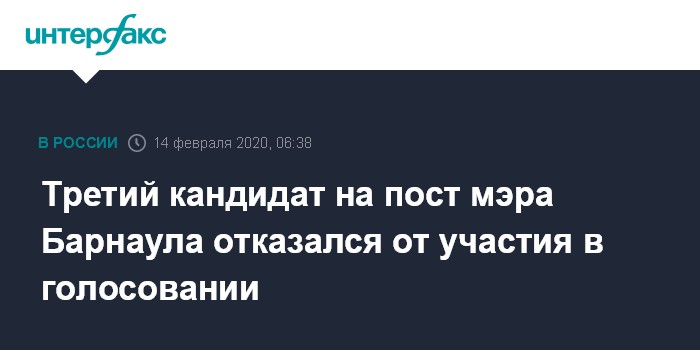 Москва. 14 февраля. INTERFAX.RU - Третий кандидат на пост главы администрации Барнаула (Алтайский край) заявил о снятии своей кандидатуры с голосования, передает корреспондент агентства "Интерфакс" с заседания Думы города в пятницу, где выбирают градоначальника.