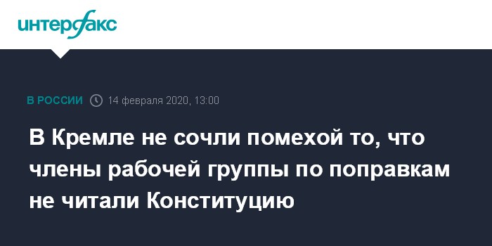 Москва. 14 февраля. INTERFAX.RU - Пресс-секретарь президента РФ Дмитрий Песков не считает проблемой, что некоторые из членов рабочей группы по подготовке поправок в Конституцию РФ до этого не читали Основной закон государства,.
