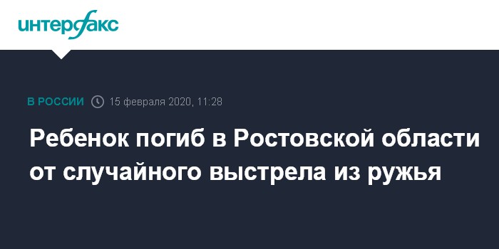 Москва. 15 февраля. INTERFAX.RU - Случайный выстрел из ружья во время поездки на охоту унес жизнь ребенка в Ростовской области, в отношении владельца оружия возбуждено дело, сообщает в субботу пресс-служба следственного управления СК РФ по региону.