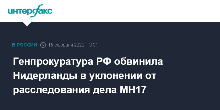 Москва. 15 февраля. INTERFAX.RU - Отказ Нидерландов в проведении суда над гражданами РФ по делу о крушении малайзийского "Боинга" рейса MH17 в 2014 году на территории России является уклонением от проведения всестороннего расследования катастрофы, заявили "Интерфаксу" в Генпрокуратуре РФ.