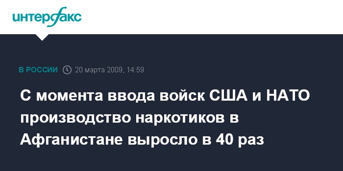 "Сосредоточение 93% посевных площадей опиумного мака в Афганистане имеет причинно-следственную связь с растущей концентрацией иностранных вооруженных сил. С момента ввода войск США и НАТО производство наркотиков в Афганистане выросло более чем в 40 раз", - сказал Иванов в пятницу, выступая перед личным составом управления службы по Петербургу и Ленинградской области.