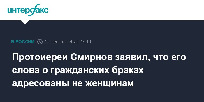 Ранее протоиерей Смирнов на встрече с участниками православного сообщества OrthodoxBRO заявил: "У нас женщины сами не понимают, что такое брак. Неохота сказать, что "я бесплатная проститутка", поэтому говорят: у меня гражданский брак. Здрасьте! Да нет, ты просто бесплатно оказываешь услуги - и всё, а так тебя никто за жену не считает".