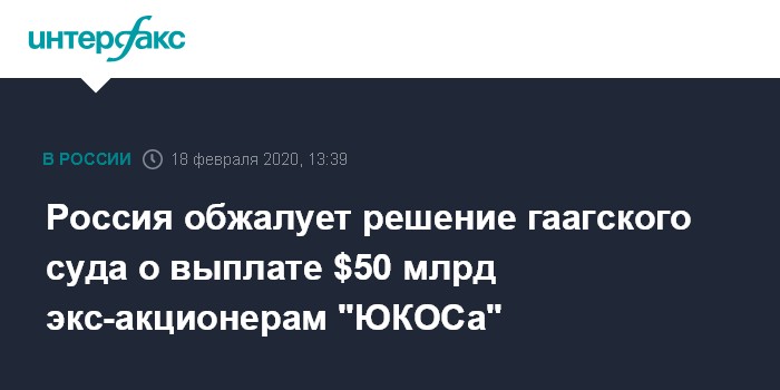 Свое решение апелляционный суд Гааги вынес 18 февраля. Он оставил в силе решение гаагского арбитража от 18 июля 2014 года. Данные решения обязывали Россию выплатить мажоритарным экс-акционерам НК "ЮКОС" 50 млрд долларов США в качестве возмещения ущерба, нанесенного ее действиями.