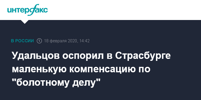 Москва. 18 февраля. INTERFAX.RU - Защита координатора "Левого фронта" Сергея Удальцова оспорила размер компенсации, которую ему присудил Европейский суд по правам человека за нарушение его прав в ходе процесса по "болотному делу". Адвокат Дмитрий Аграновский назвал 9000 евро слишком маленькой суммой.