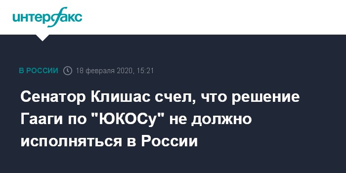 Сенатор Клишас счел, что решение Гааги по "ЮКОСу" не должно исполняться в России