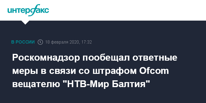 "Роскомнадзор намерен ответить зеркально по факту пристрастного отношения британского медиарегулятора Ofcom к каналу "НТВ-Мир Балтия", держатель лицензии которого был накануне оштрафован", - сообщили в РКН на запрос "Интерфакса".