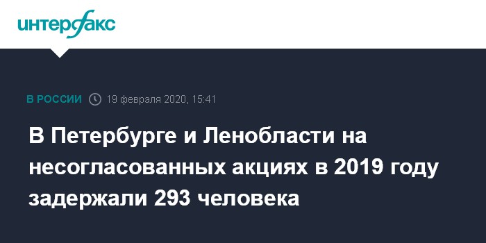 Москва. 19 февраля. INTERFAX.RU - В Петербурге и Ленинградской области в 2019 году на несогласованных акциях были задержаны в общей сложности 293 человека, сообщил начальник ГУ МВД по региону Роман Плугин. 19 февраля он представил годовой отчет ЗакСобранию.