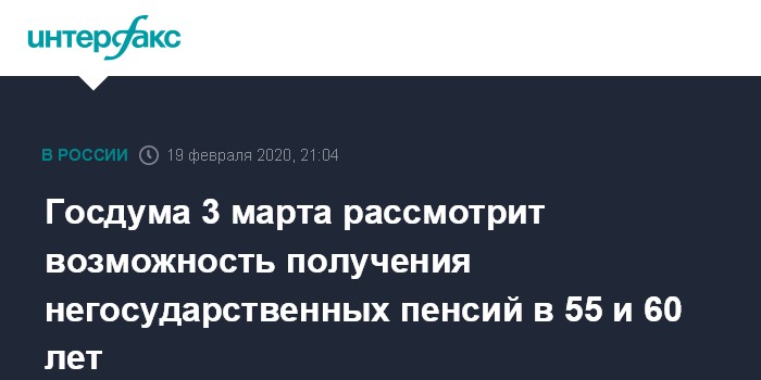 Москва. 19 февраля. INTERFAX.RU - Госдума на заседании 3 марта планирует рассмотреть во втором чтении законопроект, который дает право людям, которые заключили или собираются заключить договоры с негосударственными пенсионными фондами (НПФ), получать пенсию по достижению ранее установленного пенсионного возраста: женщинам с 55, мужчинам - с 60 лет.