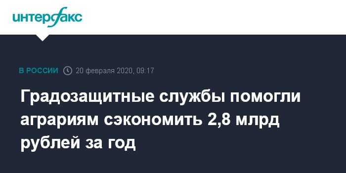 Москва. 20 февраля. INTERFAX.RU - В 2019 году градозащитные службы помогли уберечь урожай от ущерба на сумму 2,8 млрд рублей, заявил руководитель Росгидромета Игорь Шумаков.