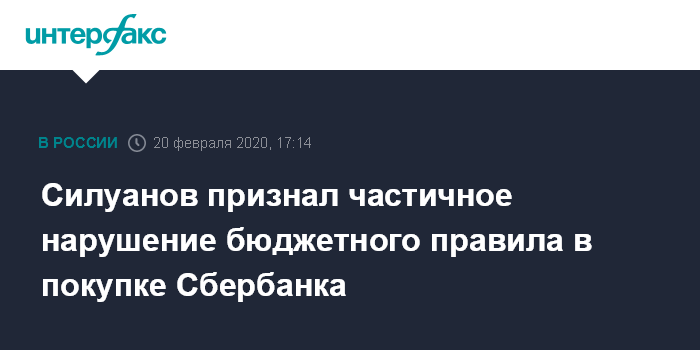 Москва. 20 февраля. INTERFAX.RU - Покупка правительством РФ пакета ЦБ в Сбербанке за счет средств Фонда национального благосостояния (ФНБ) по форме не противоречит бюджетному правилу, однако по сути элемент его нарушения здесь есть, считает министр финансов РФ Антон Силуанов.