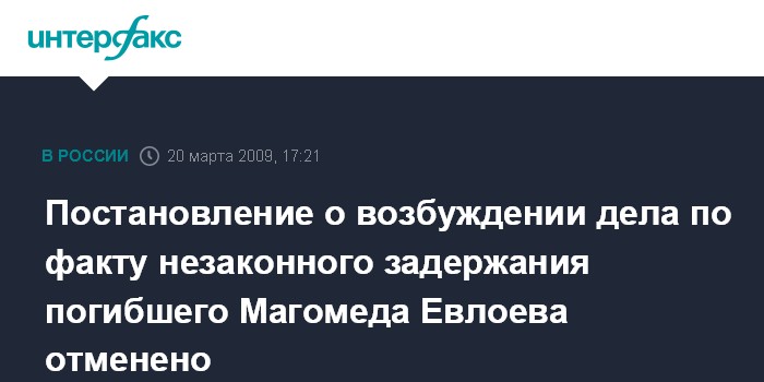 "Республиканская прокуратура отменила постановление о возбуждении уголовного дела. Это решение они не мотивировали", - сказал "Интерфаксу" в пятницу представитель семьи Евлоевых Муса Плиев.