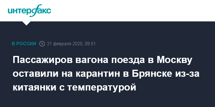 По ее словам, остальные пассажиры вагона, в котором ехала китаянка с температурой 38 градусов, направлены на карантин в Брянскую городскую больницу.