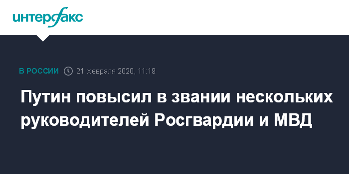 Москва. 21 февраля. INTERFAX.RU - Президент РФ Владимир Путин подписал указ о присвоении воинских званий высших офицеров и специальных званий высшего начальствующего состава.