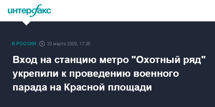 Москва. 20 марта. INTERFAX.RU - Конструкцию подземного перехода на пересечении улиц Охотный ряд и Тверская у входа на станцию столичного метро "Охотный ряд" укрепили в связи с предстоящим военным парадом на Красной площади 9 мая, сообщили "Интерфаксу" в пресс-службе метро в пятницу. "В переходе установлены специальные балки, которые обеспечат дополнительную надежность", - уточнили там.
