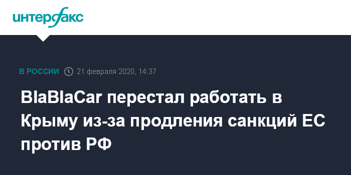 Москва. 21 февраля. INTERFAX.RU - Французская BlaBlaCar прекратила оказывать услуги на территории Крымского полуострова.