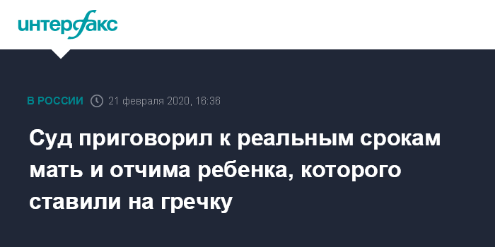 Москва. 21 февраля. INTERFAX.RU - Суд в Омске огласил приговор в отношении 35-летнего местного жителя, который избивал малолетнего сына своей сожительницы и ставил коленями на гречневую крупу, и 27-летней матери, которая не препятствовала жестокости. Об этом сообщает пресс-служба областной прокуратуры.