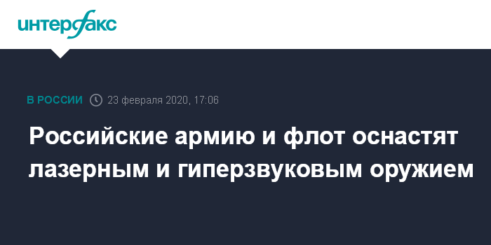 Москва. 23 февраля. INTERFAX.RU - Президент России Владимир Путин заявил, что армия и флот будут оснащаться новейшим вооружением, в том числе лазерными и гиперзвуковыми комплексами.
