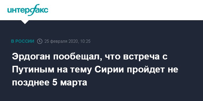 Москва. 25 февраля. INTERFAX.RU - Президент Турции Реджеп Тайип Эрдоган заявил, что намерен не позднее 5 марта провести встречу с президентом РФ Владимиром Путиным для обсуждения ситуации вокруг Сирии.