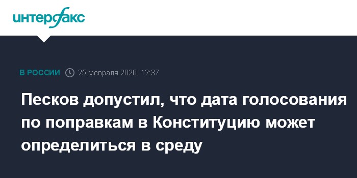 Москва. 25 февраля. INTERFAX.RU - На встрече президента Владимира Путина с рабочей группой по поправкам в Конституцию в среду может обсуждаться и дата всенародного голосования по пакету этих поправок, допустил пресс-секретарь главы государства Дмитрий Песков.