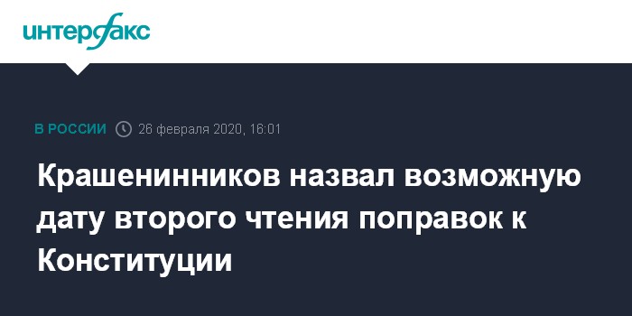 Москва. 26 февраля. INTERFAX.RU - Госдуме предложат рассмотреть во втором чтении законопроект о поправке к Конституции 10 марта, сказал сопредседатель рабочей группы по поправкам депутат Павел Крашенинников. Он назвал эту даты на встрече членов группы с президентом Владимиром Путиным.