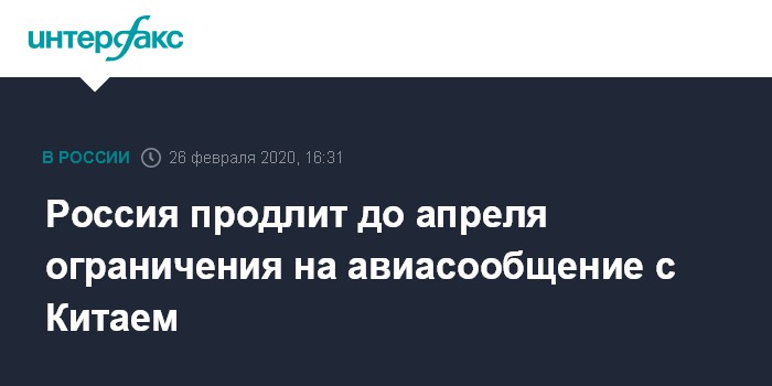 Москва. 26 февраля. INTERFAX.RU - Россия продлит до 1 апреля ограничения на пересечение сухопутной границы с Китаем и на авиационное сообщение с этой страной из-за продолжающейся эпидемии коронавируса. Об этом объявила глава оперативного штаба по контролю за вирусом вице-премьер Татьяна Голикова.