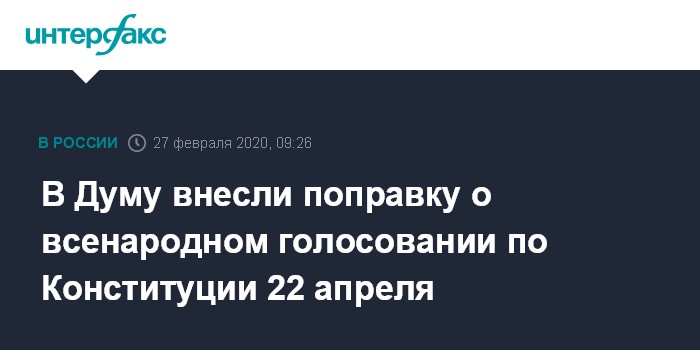 Официально дата голосования была впервые названа на встрече членов рабочей группы с президентом Владимиром Путиным 26 февраля. Ранее о том, что голосование могут провести 22 апреля, говорил информированный источник "Интерфакса".