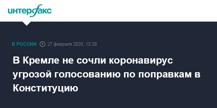 Москва. 26 февраля. INTERFAX.RU - Оснований опасаться срыва общероссийского голосования по поправкам в Конституцию 22 апреля в связи с ситуацией с распространением коронавируса в настоящее время нет, заявил пресс-секретарь президента РФ Дмитрий Песков.