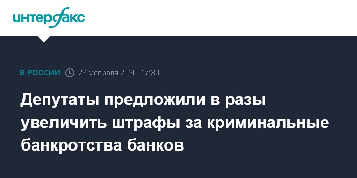 За преднамеренное банкротство кредитных, страховых организаций и НПФ, если ущерб не превысил 2,25 млн рублей, депутаты предлагают наказывать штрафом от 500 тыс. рублей до 1 млн рублей, либо лишать свободы на срок до 4 лет со штрафом до 1 млн рублей. В случае, если ущерб оказался крупным, то предлагается назначать штраф от 1 млн рублей до 4 млн рублей, либо отправлять в колонию на срок до 7 лет со штрафом до 2 млн рублей. Сейчас за такое преступление УК РФ предусматривает штраф от 200 тыс. рублей до 500 тыс. рублей, либо лишение свободы до 6 лет со штрафом в 200 тыс. рублей.