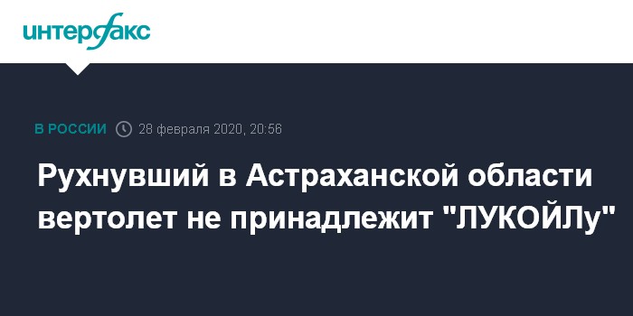 Москва. 28 февраля. INTERFAX.RU - Рухнувший в Астраханской области вертолет не имеет отношения к нефтяной компании "ЛУКОЙЛ", сообщили "Интерфаксу" в пресс-службе ООО "ЛУКОЙЛ-Нижневолжскнефть".
