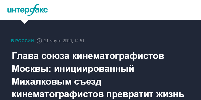 Москва. 21 марта. INTERFAX.RU - Внеочередной съезд союза кинематографистов, инициированный Никитой Михалковым, будет катастрофой для российского кино, считает глава союза кинематографистов Москвы (МСК) Павел Финн.