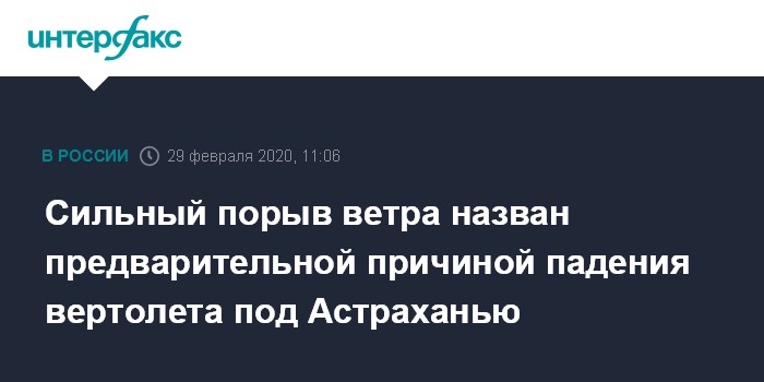 Москва. 29 февраля. INTERFAX.RU - Предварительной причиной крушения вертолета Robinson в Астраханской области назван сильный порыв ветра, из-за которого пилот не справился с управлением и допустил его падение на землю, сообщил "Интерфаксу" в субботу информированный источник.