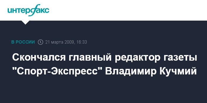 Москва. 21 марта. INTERFAX.RU - Сегодня ранним утром на 61-м году жизни скоропостижно скончался создатель и главный редактор газеты "Спорт-Экспресс" Владимир Михайлович Кучмий, сообщает "Спорт-Экспресс".