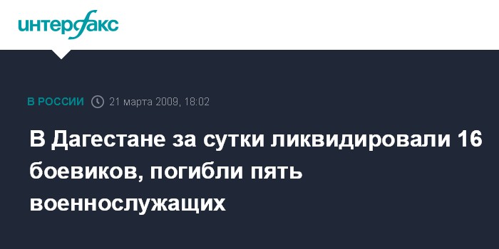 Москва. 21 марта. INTERFAX.RU - В Дагестане за последние сутки были уничтожены в общей сложности 16 боевиков, при этом погибли пять военнослужащих внутренних войск МВД.