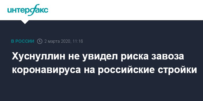 Москва. 2 марта. INTERFAX.RU - Вице-премьер Марат Хуснуллин пока не видит рисков для привлечения к работе на стройках иностранных рабочих в связи со вспышкой коронавируса. Пока, по его словам, работа идет в штатном режиме.