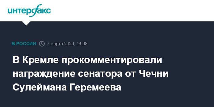 Президент РФ Владимир Путин 27 февраля подписал указ о присуждении госнаград 13 сенаторам. Среди тех, кто удостоился награды оказался сенатор от Чечни Сулейман Геремеев. Он дядя военного Руслана Геремеева, который является одним из предполагаемых организаторов убийства политика Бориса Немцова.