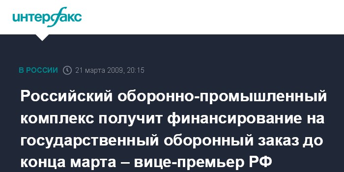 Москва. 21 марта. ИНТЕРФАКС-АВН - Предприятия российского оборонно-промышленного комплекса, которые участвуют в реализации гособоронзаказа на 2009 год, получат необходимое для этого финансирование к 31 марта, заявил в интервью телеканалу "Рен-ТВ" в субботу вице-премьер Сергей Иванов.
