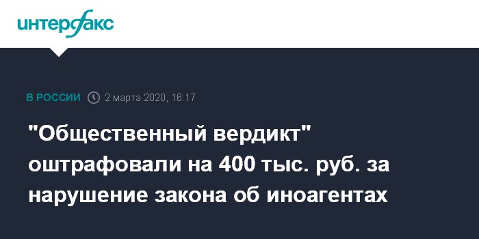 "Общественный вердикт" оштрафовали на 400 тыс. руб. за нарушение закона об иноагентах