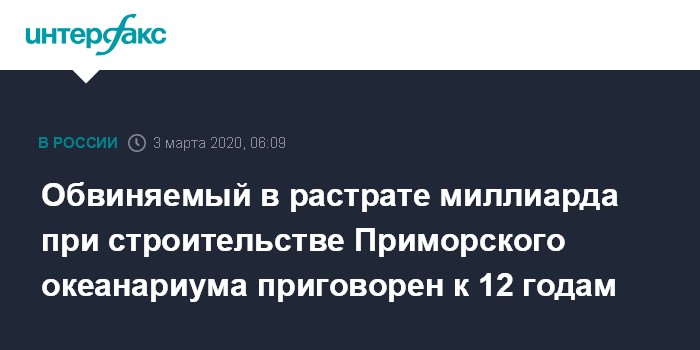 Обвиняемый в растрате миллиарда при строительстве Приморского океанариума приговорен к 12 годам