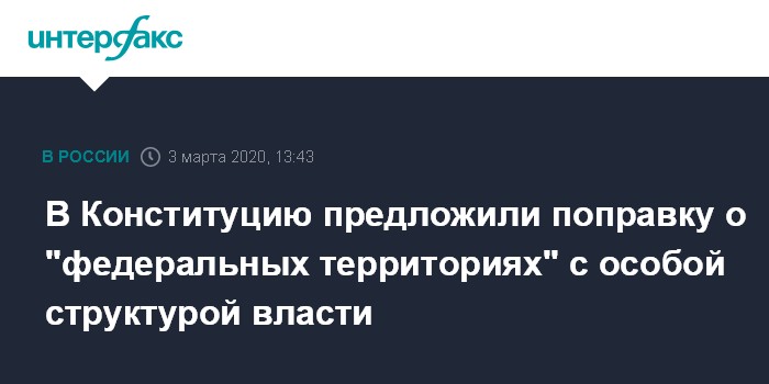 Москва. 3 марта. INTERFAX.RU - В законопроект о поправке в Конституцию ко второму чтению поступила поправка о возможности создания в России федеральных территорий. Ее текст есть в распоряжении "Интерфакса".