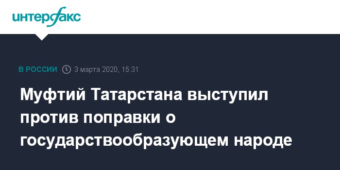 Москва. 3 марта. INTERFAX.RU - Муфтий Татарстана Камиль Самигуллин предупредил о "непоправимых последствиях" поправки в Конституцию, которая вводит понятие "государствообразующий народ". Это понятие содержится в положении о государственном языке России, которым является русский "как язык государствообразующего народа, входящего в союз равноправных народов."