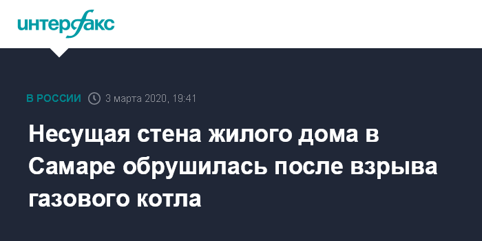 Москва. 3 марта. INTERFAX.RU - Газовый котел взорвался в многоквартирном доме в Самаре, в результате обрушилась несущая стена. Об этом сообщил "Интерфаксу" во вторник информированный источник.
